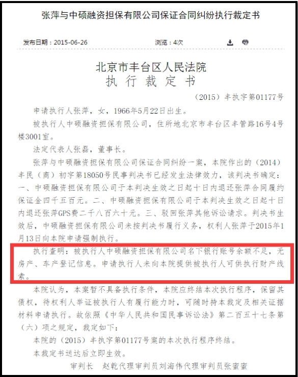 2、中硕担保涉诉案件遍布多地,被诉返还合同履约保证金的案件比比皆是,而案件最终判决虽是都以原告胜诉为结,但即使通过强制执行都拿不回欠款,理由均是“被执行人中硕融资担保有限公司名下银行账号余额不足,无房产、车产登记信息。”(见证据1,2)。