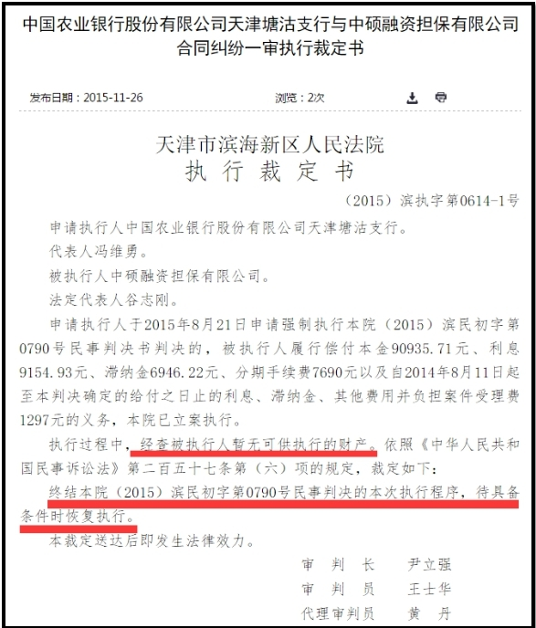 3、起诉中硕担保的原告无论是自然人还是机构,甚至包括与中硕集团“签署了总对总战略合作协议”的光大银行;涉案金额无论是几千元还是数百万,在中硕担保那里都一样,就是不还钱,强制执行也没用。