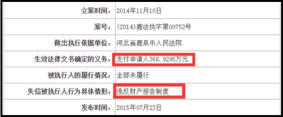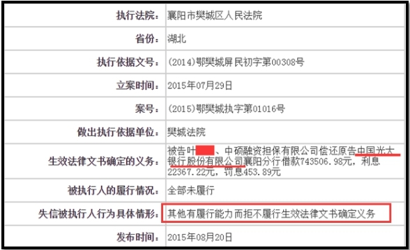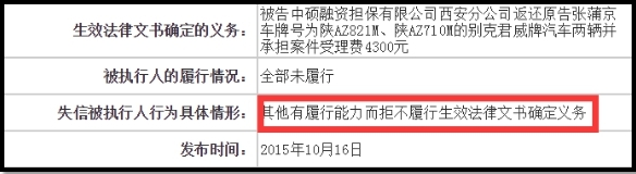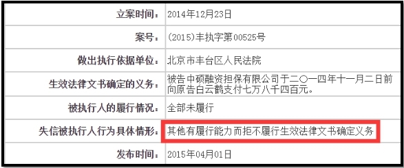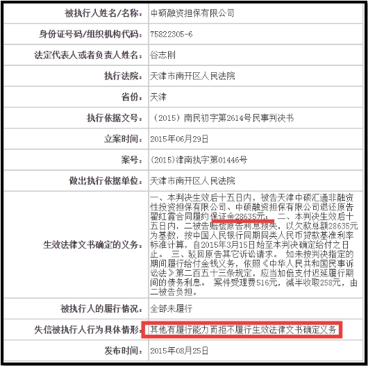 现在百度搜索中硕融资担保,首先出现的都是“该企业已经被列入国家失信被执行人名单”,被执行依据是“违反财产报告制度”,“有履行能力而拒不履行生效法律文书确定义务”(见证据3,4,5,6,7)。