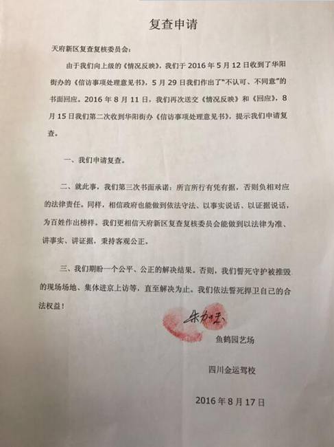 2、原来是因为成都市天府新区华阳街道办叫施工方在被推的场地强行施工,遭到苗圃工作人员的阻拦,现场警察要求朱先生必须赶赴到现场进行协调。朱先生接到电话后,立即赶赴苗圃现场,在现场对警察解释道:“因为合法名贵树木被摧毁没有得到解决,公司员工为了要守住现场才不得已进行阻拦”。警方却不依不挠,不听解释,一副公安机关现在要依法办案了,不用问因果关系,要将朱先生及公司员工“打击处理”以了解此事“维护社会稳定”的样子威胁朱先生等人不得阻拦施工,否则就要采取措施。随后朱先生等人出示相关证据,警方亦不予理会,而后派出所所长赶到现场,要求立即施工,并要朱先生和出警民警一同回成都市天府新区华阳街道办协商解决。