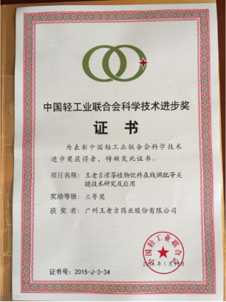 2016年6月,“王老吉凉茶植物饮料在线调配等关键技术研究及应用”获2015年度全国轻工业系统科技进步三等奖。据了解,“中国轻工业联合会科技进步奖”是由中国轻工业联合会(前身为国家轻工业局)设立的最高轻工科技奖项,属于国家部级科技奖励,代表了轻工行业技术奖励的最高级别,被认为是轻工业的“荣誉勋章”。