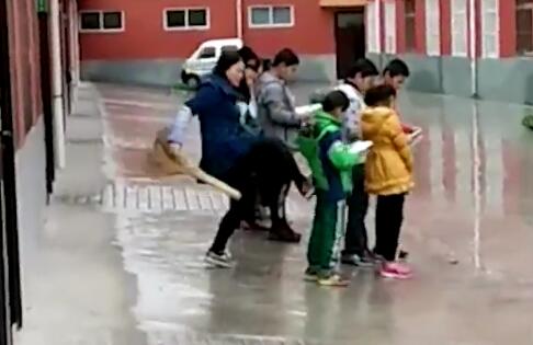 视频显示,约10名小学生模样的孩子雨中站在教学楼前的空地上,列成一排;一名疑似教师的女子右手拿着扫帚,开始挨个踹学生的屁股,男女生都被踹了一脚,有个别学生差点被踹倒。