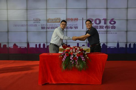 团车网销售总监郭隽(左)与深圳广播电影电视集团都市频道《都市路路通》独立制片人赵潜签订深圳惠民团车节合作协议