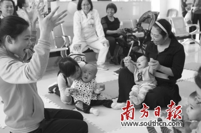 在音乐声中,家长们用玩具吸引自己的宝宝往前爬行。近日,东莞市人民医院举行了首场“试管婴儿”集体聚会,共有来自20个家庭的试管婴儿参与。记者了解到,今年以来,随着全面二孩政策的放开,该院试管婴儿的数量明显上升,增加超过四成。该院相关负责人表示,其中不少是高龄女性。