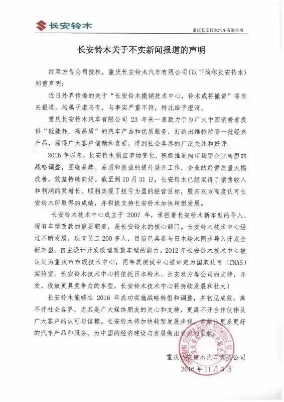 11月3日下午,长安铃木中国发布了题为《长安铃木关于不实新闻报道的声明》官方声明,不仅对上述文章内容进行了驳斥,通过对于现阶段长安铃木的经营状况做了明细梳理。