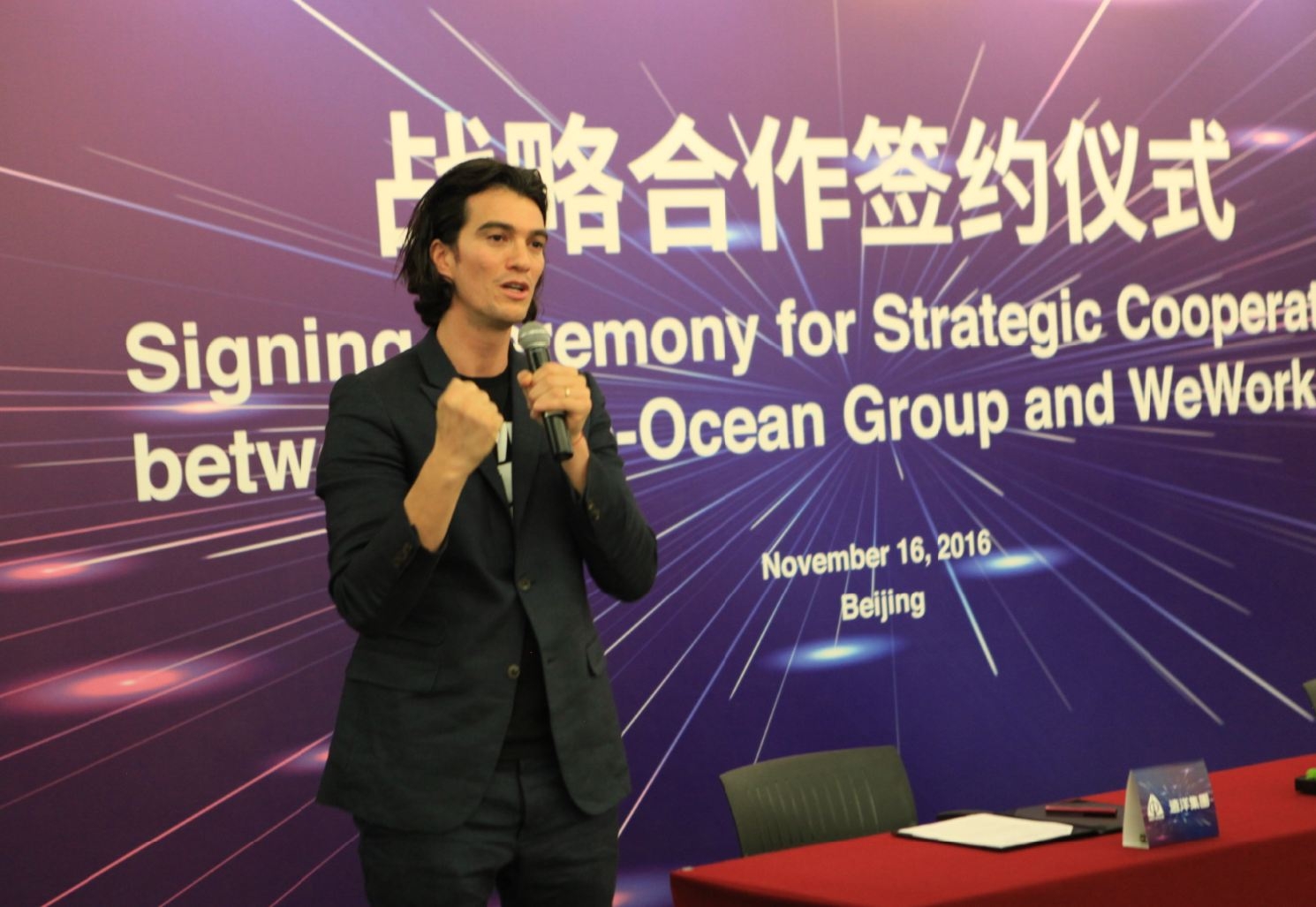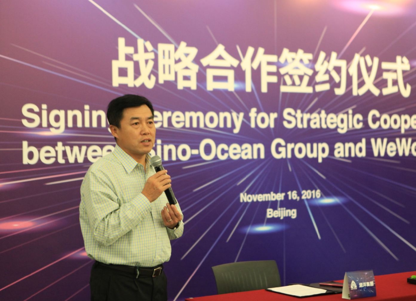 2016年11月16日下午,北京远洋国际中心A座,远洋集团总部3377会议室,远洋集团董事局主席、总裁李明,与美国WeWork联合创始人兼首席执行官亚当·纽曼(Adam Neumann)共同出席了战略合作协议签约仪式。远洋集团副总裁温海成、WeWork亚太区董事总经理Ole Ruch在协议上签字。