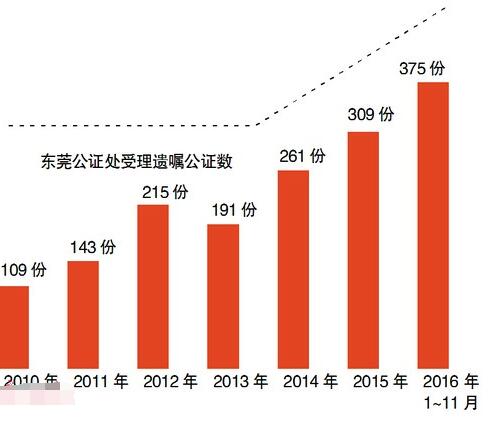 东莞公证处提供的数据显示,2010~2015年,6年间,东莞公证处受理遗嘱公证数据呈逐年增长趋势,今年截至11月上旬,遗嘱公证也已经达到了375份,还不包括此次为期两个月的免费办理数。