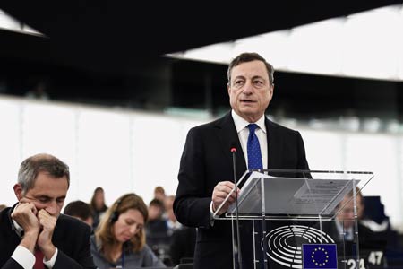 11月21日,在法国东部斯特拉斯堡,欧洲中央银行行长德拉吉在欧洲议会就欧洲中央银行2015年度报告发表讲话。