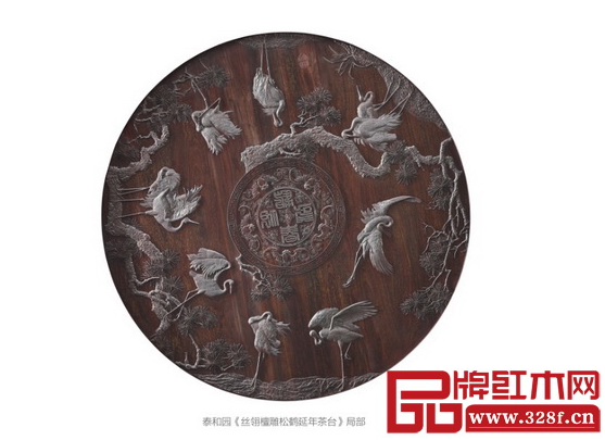 泰和园《丝翎檀雕松鹤延年茶台》局部