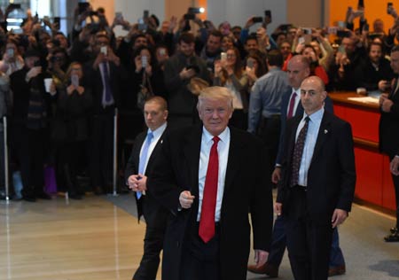 11月22日,在美国纽约,美国当选总统特朗普(前中)离开《纽约时报》大楼。