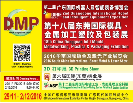 东莞拥有华南地区最庞大的工业基地,共有180多个工业区及经济区,5万多家企业。因此东莞DMP机械展的组成也十分庞杂,整个展会由东莞市政府主办的第二届广东国际机器人及智能装备博览会;第18届DMP东莞国际模具、金属加工展、橡塑胶及包装展;2016华南国际钣金及激光产业展览会;第6届国际(东莞)铸业、3D打印;第12届东莞国际电镀工业、表面处理及涂料展等多个部分组成。