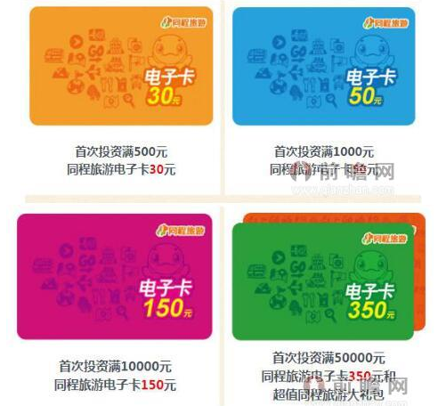 参与方式简单明了:新用户只要在活动期间首次投资满500元,赠送同程旅游电子卡30元;首次投资满1000元,赠送同程旅游电子卡50元;首次投资满10000元,赠送同程旅游电子卡150元;首次投资满50000元,赠送同程旅游电子卡350元,还可额外获赠同程旅游优惠大礼包一份。新老用户活动期间累计加权投资总额排名前五的投资人,可获得价值不等的同程旅游卡一张及同程旅游优惠大礼包一份。