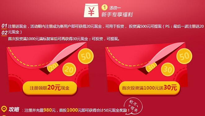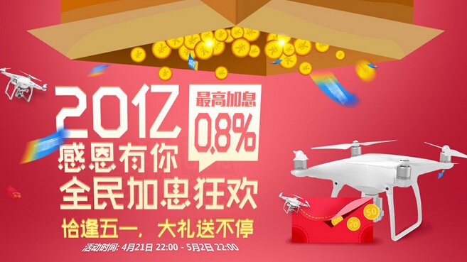 为庆祝平台成交额突破20亿,并感恩回馈诚汇通用户的支持和信任,4月22日至5月2日期间举行“感恩20亿·加息狂欢”活动,活动期间凡是新注册的用户可获得20元现金,凡是首次在平台投资且满1000元可获得30元现金;全场除一月标之外,其他所有标的均有加息,最高加息0.8%,最大程度的让利投资人;此次活动的重头大奖是科技潮品大疆无人机,活动期内累计投资满500万元,赠送大疆无人机Phantom 4,活动期内累计投资满300万元,赠送大疆无人机Phantom 3 Advanced,活动期内累计投资满150万元,赠送大疆无人机Phantom 2,这一次让小城带着你一起飞。