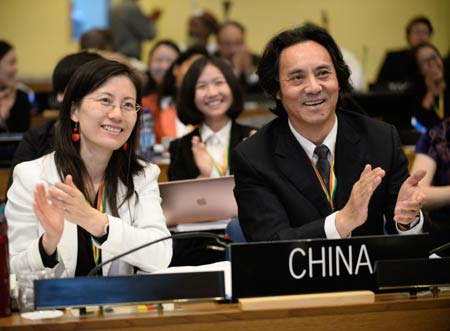 图为中国与会代表庆祝“二十四节气”列入联合国教科文组织人类非物质文化遗产代表作名录。