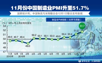 国家统计局服务业调查中心和中国物流与采购联合会,12月1日发布中国采购经理指数。数据显示,11月,制造业PMI为51.7%,延续上行走势,升至两年来高点;中国非制造业商务活动指数为54.7%,连续三个月上升,为2014年7月以来的高点,继续保持平稳较快增长。