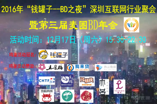 2016年即将过去,麦圈的创始团队麦农们,开始邀请深圳互联网的小伙伴们来参加第三届深圳互联网BD年会啦!麦圈本届年会主题为“钱罐子-BD之夜”,麦农一如既往始终坚持初心,麦圈聚会的经典环节以自我介绍开始,为深圳的互联网运营创造更多交流和合作机会。感谢深圳钱罐子金融平台为年会的冠名支持,也希望深圳的BD小伙伴在2017年财运亨通。