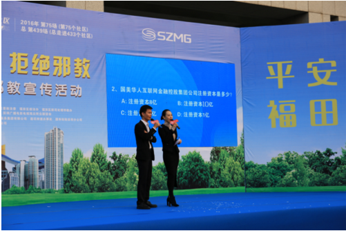 2016年12月10日,由福田区委政法委、福田区综治办、福田区反邪教办主办,国美华人金融和福田区莲花街道办协办的以“崇尚科学,拒绝邪教”为主题的福田区反邪教宣传活动拉开帷幕。