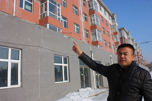 (“绥化泓翔公司”副总经理王静波告诉记者,他手指的这栋楼,就是棚改户已经入住的8栋楼之一)