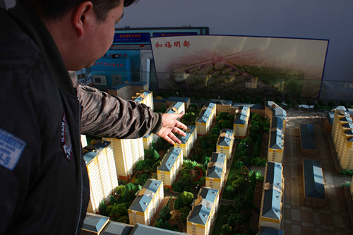 (“绥化泓翔公司”的工作人员在和福名都小区的沙盘前向记者介绍相关情况)