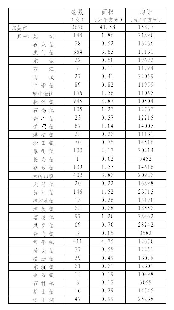 东莞楼市限购政策实施两个月以来,一手房价正逐步回落。今日(12月19日),东莞市统计局发布的数据显示,2016年11月全市新建商品住宅网上签约销售3696套,销售面积41.58万平方米,按照销售面积和销售金额进行计算,销售均价为15877元/平方米。这是今年内东莞一手房均价第二次出现回落。