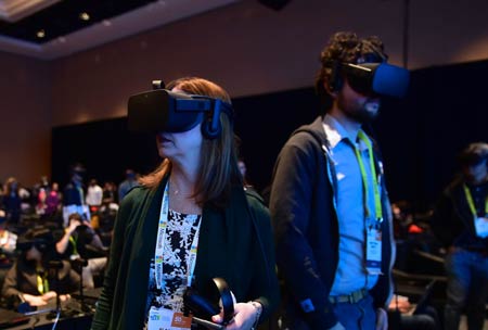 图为1月4日,人们在消费电子展媒体日的英特尔公司发布会上体验虚拟现实技术产品