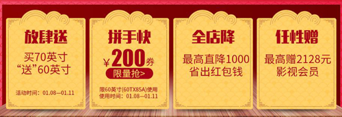 同时,夏普45 英寸互连网电视也直降200元,既以2499元的实惠价格便可购入。从1月8日-11日,登陆夏普官方商城活动页面,购买互连网电视产品即可参与200元抢券活动,同时可享受最高直降1000元和最高赠2128元影视会员的福利。
