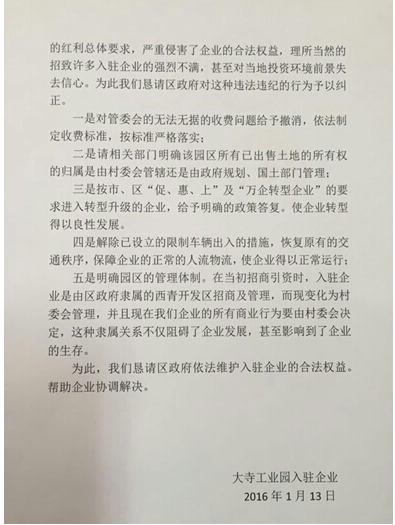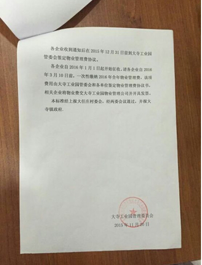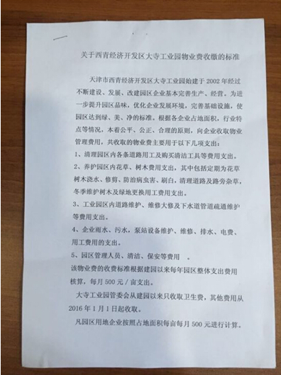但是各家企业认为,企业房地产证是由国土资源局出示,厂房由自己投资建设的,产权理应归企业所有,并且企业一直依法纳税,大寺工业园管委会收取管理费完全不合理,也不合法。因此,没有物价局下发的正式文件之前,各家企业均拒绝缴纳管理费。