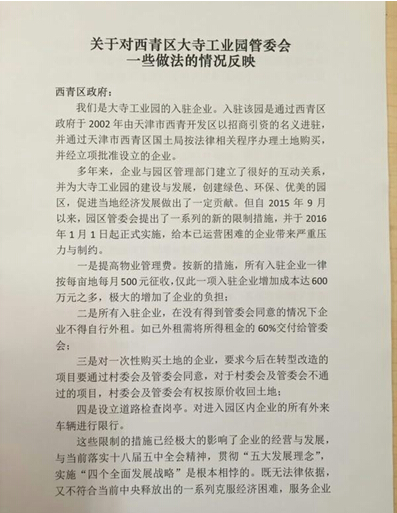 希望天津大寺工业园管委会早日醒悟:挽救企业生命,就是挽救他们自己!