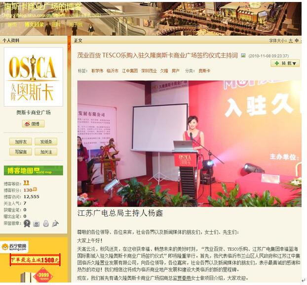 据了解,2010年下半年,久隆公司投资建设的久隆奥斯卡商业广场尚未竣工即面向社会公开招商,并在临沂蓝海国际大饭店举行了声势浩大的TESCO乐购、江苏广电集团幸福蓝海国际影城入驻久隆奥斯卡商业广场签约仪式。