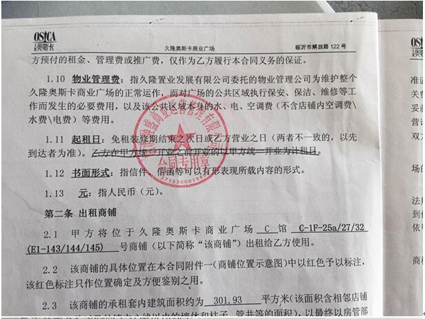 蒋先生说:“我于2011年1月26日与融盛公司(久隆奥斯卡商业广场)签订店铺租赁协议,做美特斯邦威服饰专卖店。签订时整个工程还在施工中,融盛公司承诺说是2011年5月1日至2016年4月31日五年合同,房租从商场统一整体开业起计算房租。结果到2011年7月中旬商场还未竣工,融盛公司通知进场装修,要求我带头配合他们商场把形象装修出来。我为了配合融盛公司工作,于2011年9月21日装修完毕,同时购买了总公司道具、灯具,总投资二百多万元。结果,从融盛公司承诺的2011年5月1日开业开始,接着就是2011年10月1日、2012年5月1日、2012年10月1日,一直都是这样拖着,欺骗我们,造成我们每季货品积压,处理后亏损二百多万。2012年11月,融盛公司设圈套,要求预缴房租,先把我们套进去。我预缴了2万元,后来到2012年大年二十八日(既2013年2月8日)又催要预缴房租,我没缴,他们公司就把我店铺全部锁起来扣押,里面有2012年秋冬装一百五十多万,一直扣押到2014年9月24日,临沂市兰山区法院执行,造成我这家店铺二百三十万的经济损失。我想去店铺拍照,融盛公司每次都安排七八个保安阻止不让拍。融盛公司是一家私企,不是行政执法单位,有什么权利扣押我的物品?他们给我造成的损失谁来承担?”