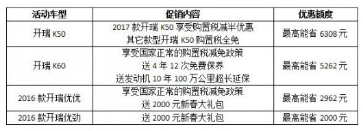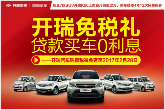 据了解,2017年,国家调整了购置税减免政策,自1月1日起至12月31日止,对购置1.6升及以下排量的乘用车按7.5%的税率征收车辆购置税。但是开瑞汽车为减小广大民众创业购车压力,特别推出延续购置税减免政策活动至2月28日,使购车创业两不耽误。