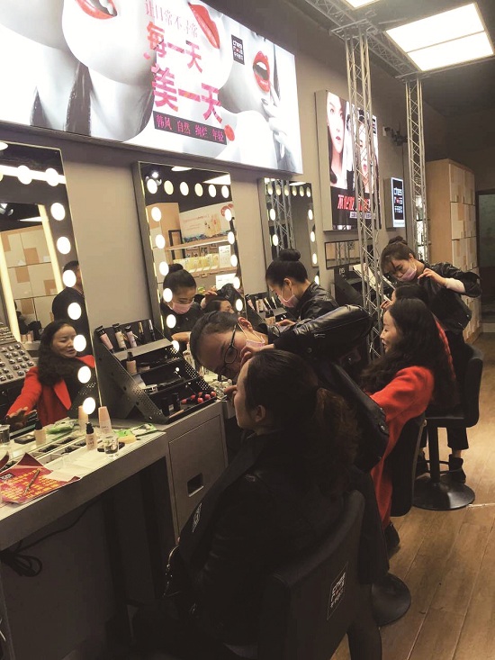 文彬是千千氏云南保山店的化妆师,刚服务完一位顾客,他马上对学员进行现场讲解:“接待顾客要结合她的个人特点和消费场景,那位顾客眼宽唇厚,妆后参加闺蜜聚会,最适合韩式淡妆”。文斌口中的顾客刚刚消费了三千多元,而他从始至终没有进行推销。