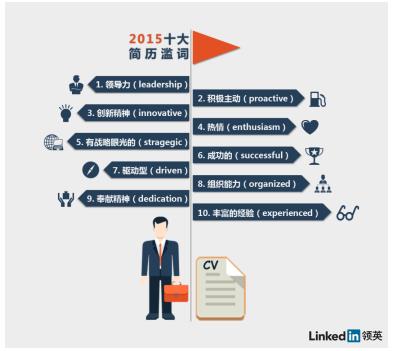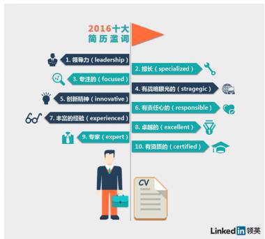 2017年2月15日,北京 — 新的跳槽季来临,想要挑个金饭碗的职场人将怎样叩开新的职场大门?“老司机”们如何才能在求职路上“换挡超车”?日前,全球最大的职场社交平台LinkedIn(领英)公布了2016年该平台用户用滥的简历流行词榜,“领导力、擅长、专注”最受追捧,而“有战略眼光、创新精神、有责任心”等流行大词也闯入前十。值得注意的是,与2015年的榜单相比,去年有半数职场人热衷塑造个人专业性形象,“卓越的、专家、有资质的”等高频词汇均是首次现身简历流行词TOP10榜单。