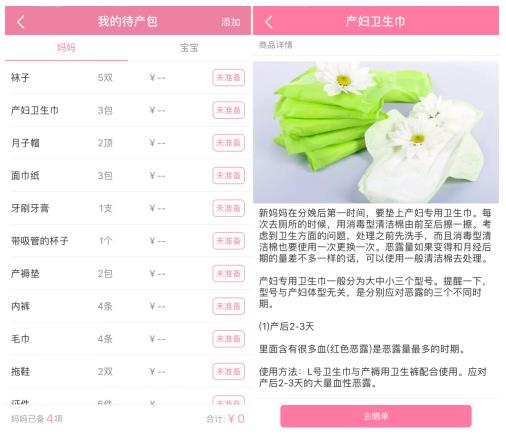 事实上,关于待产包需要注意的事项还有非常多,比如产妇卫生巾,在产后的不同时间里需要使用的尺寸大小也需根据恶露的量来进行调整配合;如何准备哺乳文胸以及需要注意的事项等等。事项多而繁琐,现在各位准妈妈只需打开柚宝宝孕育的孕期工具,就可快速找到属于你自己的“待产包”!柚宝宝孕育将妈妈用品和宝宝用品分开记录,并将待产包需要准备的物品一一为列出,数量、品牌、价格、照片等均可上传,轻轻一点便可以可以清晰看到还有哪些物品没有准备。此外,针对每项待产包物品,柚宝宝孕育均有详细的介绍说明,为什么要准备、如何准备,准妈妈根据介绍即可进行选购和添置,更加方便省心!