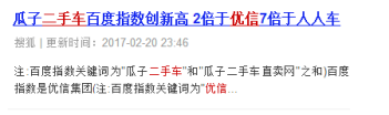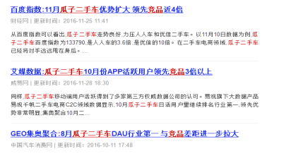 姑且不说这些数据是否准确,通过购买行业报告获得“排名”已经是圈里屡见不鲜的事情了,但是标题直接用竞品对比做宣传却并不常见,瓜子二手车也算开创了业界先河。