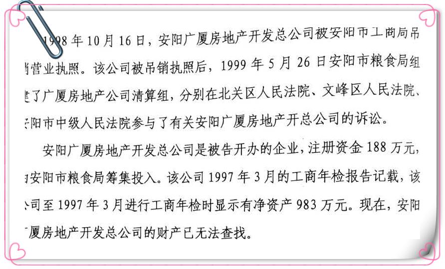 查阅相关资料得知:安阳市广厦房地产开发总公司是安阳市粮食局于1993年4月投资设立的全民所有制企业。1998年7月,公司在经营期间从工商银行贷款138万元,到期没有归还。1998年10月,因为没有按时参加年检,安阳市工商局吊销了该公司的营业执照。
