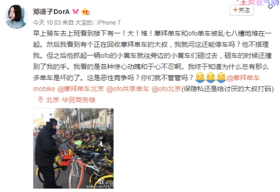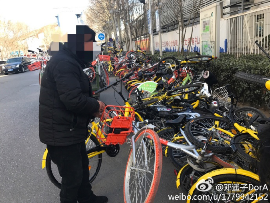 但是,谁能曾想到,摩拜单车自己也在破坏损毁着共享单车?2月28日,北京网友@邓遥子DorA 发布微博爆料,摩拜单车工作人员在回收单车之余,还不忘破坏竞品ofo小黄车。“他抓起一辆ofo的小黄车就往旁边的小黄车们砸过去,砸车的时候还撞到了我的手。我看的是各种惊心动魄和于心不忍啊。我终于知道为什么总有那么多单车是坏的了。”