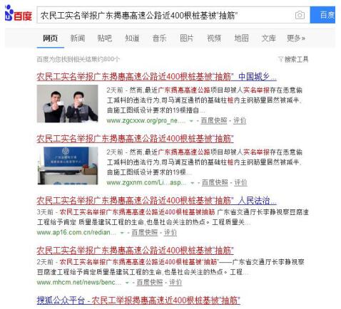 近日,一篇《农民工实名举报广东揭惠高速公路近400根桩基被“抽筋”》的新闻报道在全国引起轰动,一些门户网站的点击量暴增几十万。农民工周卫华、王冬水向媒体实名举报高速A3标段存在严重质量问题后。为了落实两位举报人的举报事实,媒体联系了广州市政公司。广州市政驻揭惠高速公路A3标项目部负责人李宏斌(音)冒充该公司法务部的人员打来电话,向媒体叫嚣:“我们是国企,你们媒体算什么东西?即使报道出来又能把我们怎么着?!!!”