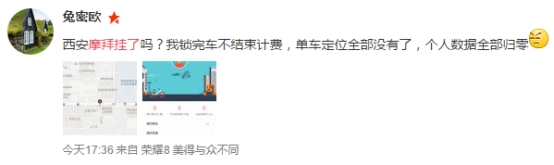 “西安摩拜挂了吗?我锁完车不结束计费,单车定位全部没有了,个人数据全部归零。”