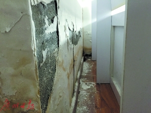 在全女士家,因为同样漏水严重,一旁的卧室已经失去了原本住人的功能,卧室内靠厕所一边的壁柜已经因为潮湿出现了密密麻麻白色的霉菌,墙壁和天花板更是出现了墙体脱落现象。(记者 龙成柳)(来源:广州日报)