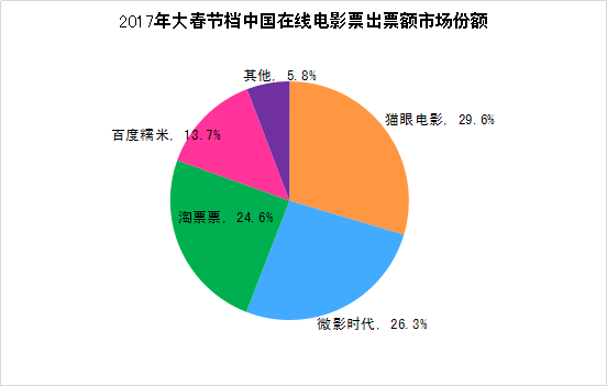 比达咨询最新发布的《大春节档在线票务报告》(1月28号-2月14号)继续用数据论证着这一点。报告显示,2017年中国电影市场迎来开门红。其中春节档累计票房31.3亿,同比增长4%。与此同时,在出票额市场份额方面猫眼电影、微影时代、淘票票三家独大,份额名次与16年保持不变,瓜分掉五分之四的市场蛋糕。做大做强的背后,各家都有自己的杀手锏: