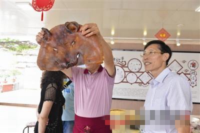 “制作一张腊味猪头皮至少需要15天时间,期间过程别提有多复杂繁琐,但每次拿到那张猪头皮时,你会发现,它象是在对你笑。”辉叔指着一排成品,那里的每一张猪脸都是一张一模一样的笑脸,颇具艺术喜感。