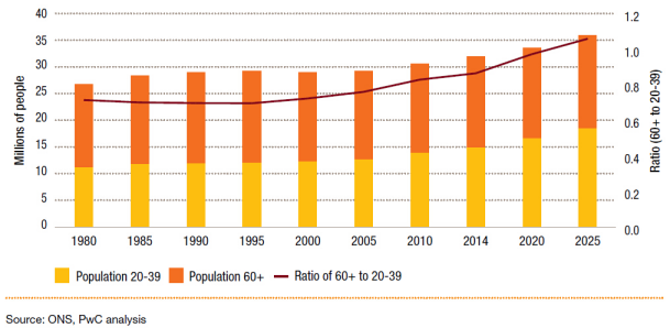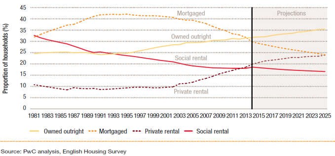 在租金方面,根据四大会计师事务所PwC报告指出:英国的人口趋向年轻化,年龄介于20-39的人口数目将会与超过60岁的人口数目相约(图2),而年轻人更倾向于租房,因此预测租房的需求会持续上升(图3),预测英国房产及租务市场长远走势强劲!