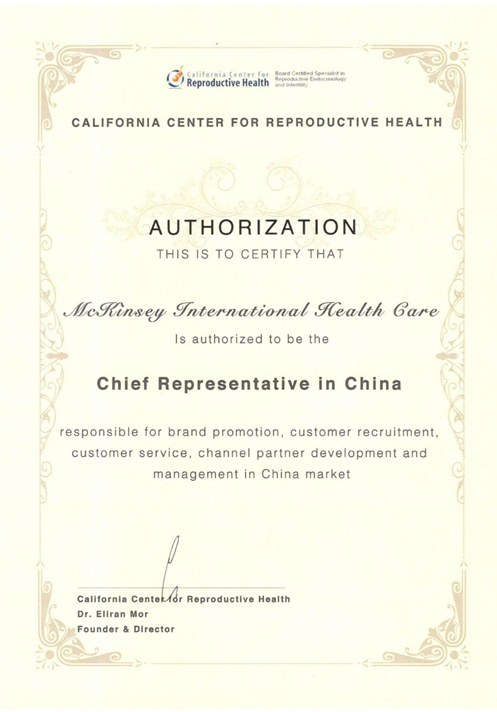 麦肯锡健康创始人樊琴女士表示,麦肯锡健康成立至今已与多家美国顶级辅助生殖机构建立了紧密的联系,与美国加州生殖医学中心(CCRH)的战略合作不仅仅是一次重要的联姻,更是麦肯锡健康建立海外医疗产业链条上重要的一环,麦肯锡健康将建立完善的海外医疗产业链帮助国人享受全球的优质服务,
