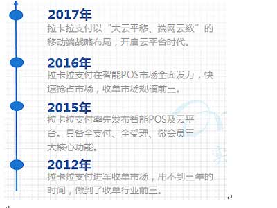 从2012年进军收单市场以来,拉卡拉用不到三年的时间跻身行业前三,并率先发力智能POS市场,收单规模已达万亿级别。