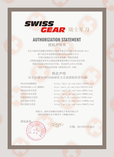 本公司福州市鼓楼区盾牌电子商务有限公司为SWISSGEAR Sàrl旗下著名多功能箱包品牌SWISSGEAR瑞士军刀中国大陆地区电子商务唯一授权代理商并授权福建省泉州市正能量品牌策划有限公司为京东总代理。授权日自2014年9月26开始,至2020年12月31日结束,以双方所约定的详细《授权协议书》为准。