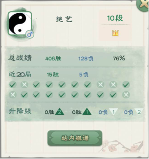 “绝艺”名字,源自唐代杜牧的送别诗“绝艺如君天下少,闲人似我世间无”。“绝艺”曾先后使用多个ID,在腾讯围棋(野狐围棋)平台与业余和职业高手切磋,多次战胜中日韩三国一众顶尖棋手,成为腾讯围棋首个晋级“十段”的棋手。截至3月9日,“绝艺”对局数量达534盘,战绩是406胜128负,胜率76%,与柯洁、古力、常昊、范蕴若、范廷钰、朴廷桓等超过100位知名人类棋手有过交锋。