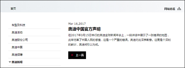 在奥迪中国所发布的道歉声明中,并未提到官网上使用的这张错误地图。