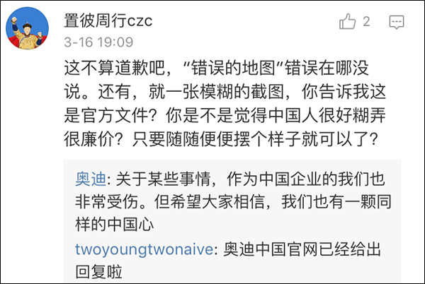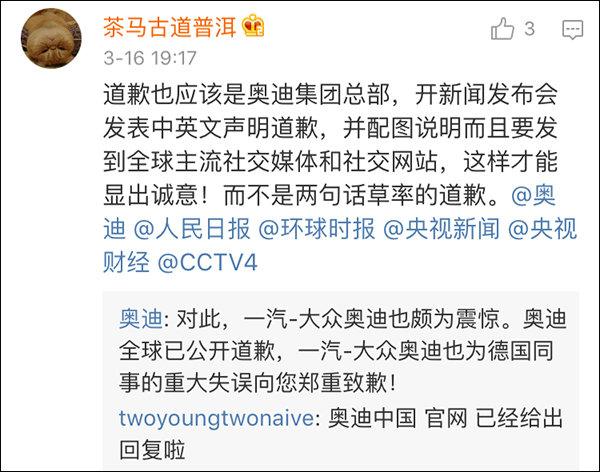 不过对此,网友们却并不买账。他们认为就算是道歉,也应该是奥迪集团总部来道歉。