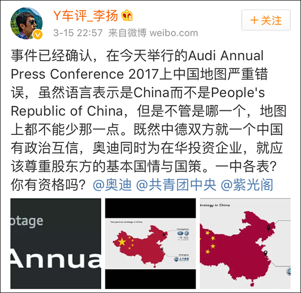 【观察者网 综合报道】多家国内汽车媒体近日报道称,3月15日,汽车品牌奥迪在德国大众总部沃尔夫斯堡举办全球新闻年会介绍其中国业务时,PPT中所使用的中国地图出现了严重的错误,引起舆论界的广泛关注。